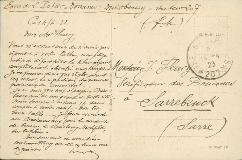 Alte Ansichtskarte aus Duisburg-Hochfeld, gelaufen am 14.04.1923.