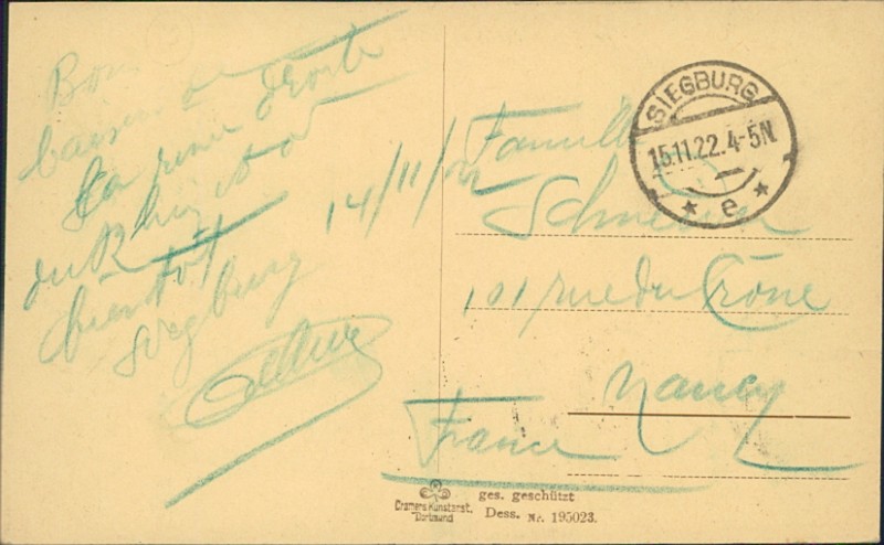 Alte Ansichtskarte aus Siegburg, gelaufen am 15.11.1922 von Siegburg nach Nancy (Frankreich).