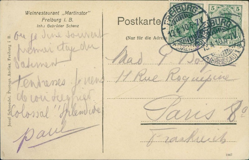 Alte Ansichtskarte aus Freiburg im Breisgau, gelaufen am 13.04.1910 von Freiburg (Breisgau) nach Paris.