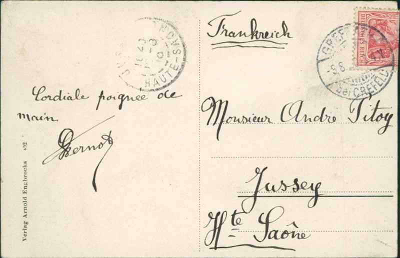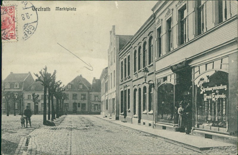 Alte Ansichtskarte aus Grefrath, gelaufen am 09.08.1910 von Grefrath bei Crefeld nach Jassey.