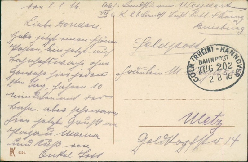 Alte Ansichtskarte aus Oberhausen, gelaufen am 02.08.1916 von Cöln (Rhein)-Hannover (Bahnpost) nach Metz.