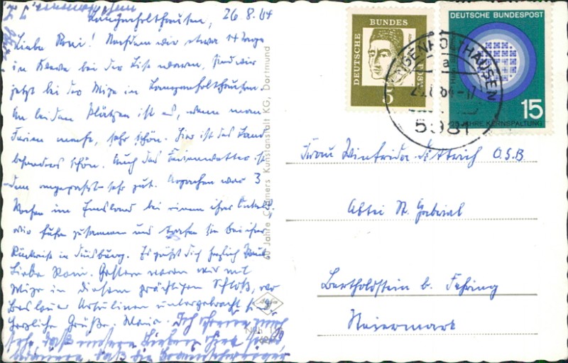 Alte Ansichtskarte aus Arnsberg-Herdringen, gelaufen am 26.08.1964.