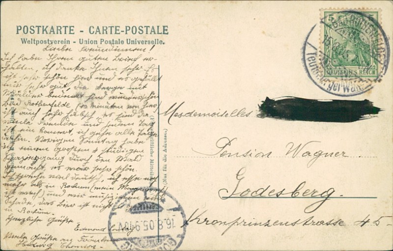 Alte Ansichtskarte aus Bad Rothenfelde, gelaufen am 15.08.1905 von Bad Rothenfelde Teutoburger Wald nach Godesberg. Ankunft in Godesberg am 16.08.1905.