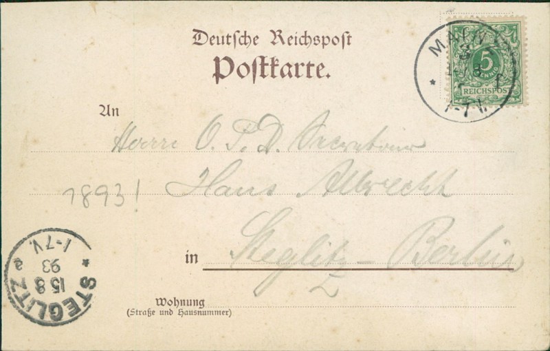 Alte Ansichtskarte aus Wiesbaden, gelaufen am 14.08.1893 von Mainz nach Steglitz-Berlin. Ankunft in Steglitz-Berlin am 15.08.1893.