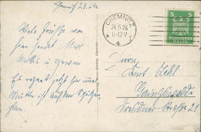 Alte Ansichtskarte aus Chemnitz, gelaufen am 24.05.1926.