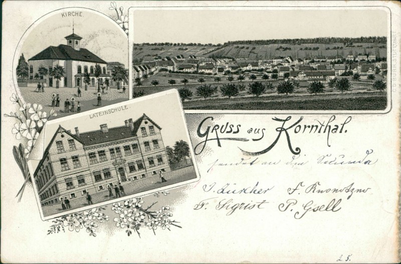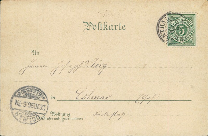 Alte Ansichtskarte aus Korntal-Münchingen, gelaufen um 1896 von Kornthal nach Colmar. Ankunft in Colmar am 26.10.1896.