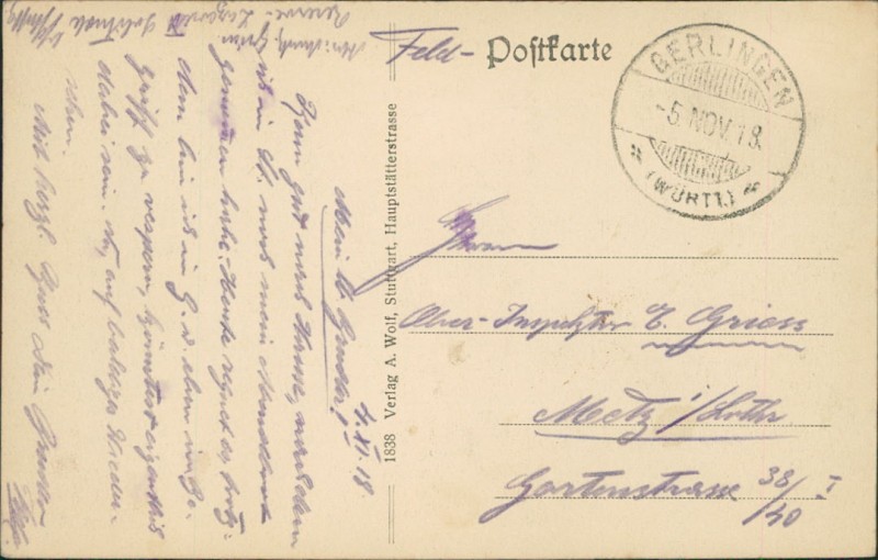 Alte Ansichtskarte aus Gerlingen, gelaufen am 05.11.1918.