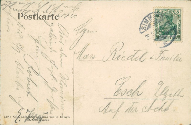 Alte Ansichtskarte aus Simmern, gelaufen am 26.08.1913 von Simmern nach Esch Alzette.