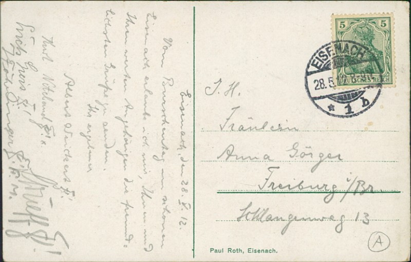 Alte Ansichtskarte aus Eisenach, gelaufen am 28.05.1912 von Eisenach nach Freiburg i. Br.