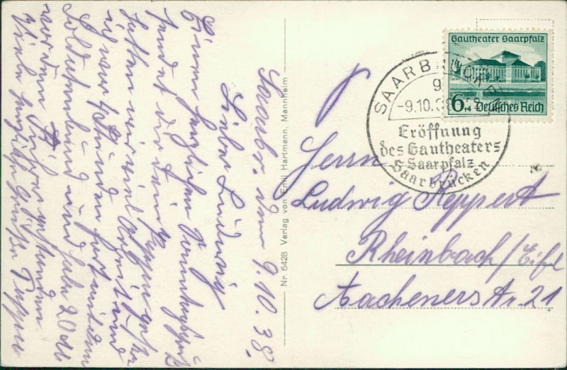 Alte Ansichtskarte aus Saarbrücken, gelaufen am 09.10.1938 von Saarbrücken nach Rheinbach/Eifel.