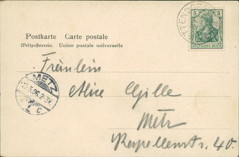 Alte Ansichtskarte aus Ettendorf, gelaufen am 14.05.1906 von Ettendorf nach Metz. Ankunft in Metz am 15.05.1906.