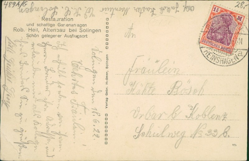 Alte Ansichtskarte aus Solingen-Altenbau, gelaufen am 19.06.1922.