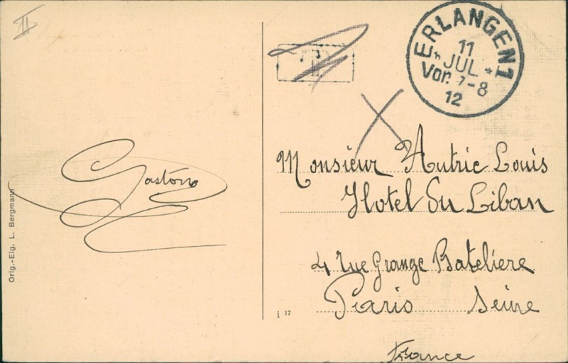 Alte Ansichtskarte aus Erlangen, gelaufen am 11.07.1912 von Erlangen nach Paris.