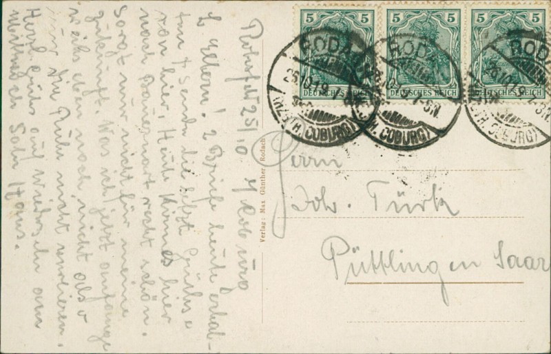 Alte Ansichtskarte aus Bad Rodach-Roßfeld, gelaufen am 26.10.1919 von Rodach nach Püttlingen.