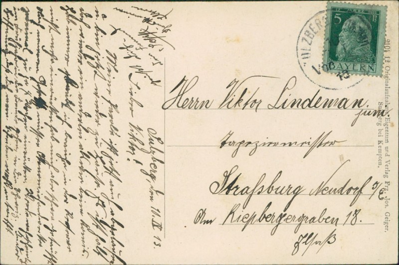 Alte Ansichtskarte aus Sulzberg, gelaufen am 10.09.1913.