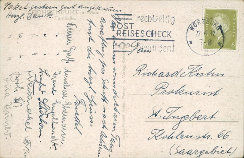 Alte Ansichtskarte aus Ochsenfurt, gelaufen am 22.06.1932 von Würzburg nach St. Ingbert.