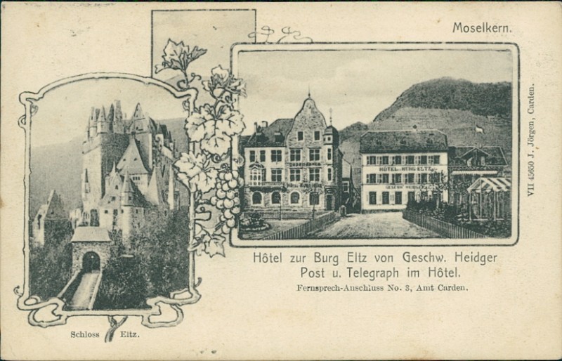 Hotel zur Burg Eltz von Geschw. Heidger. Post u. Telegraph im Hotel. Fernsprech-Anschluss No. 3, Amt Carden