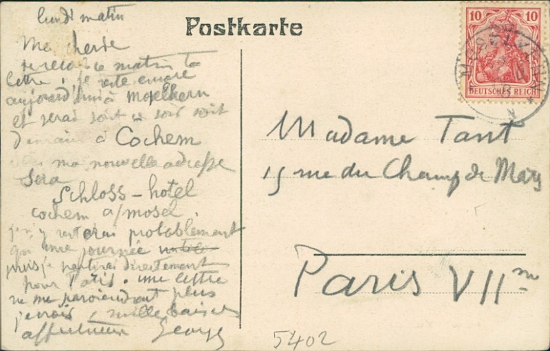 Alte Ansichtskarte aus Moselkern, gelaufen um 1908 von Moselkern nach Paris.