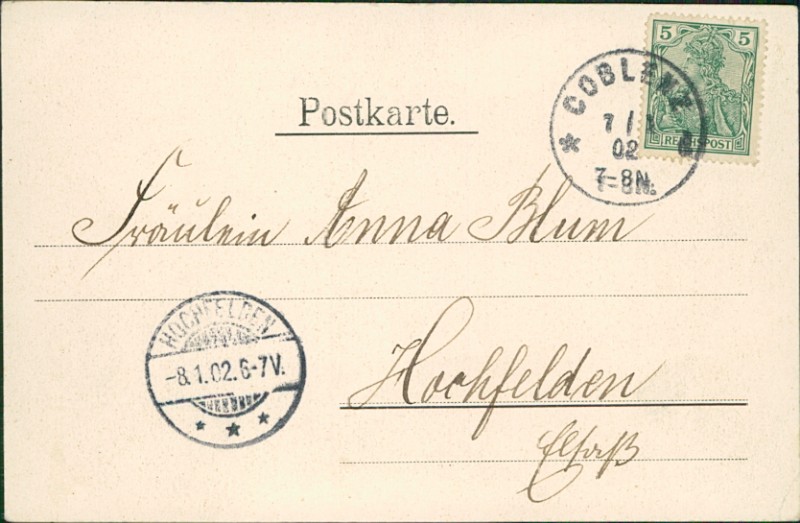 Alte Ansichtskarte aus Koblenz, gelaufen am 07.01.1902 von Coblenz nach Hochfelden. Ankunft in Hochfelden am 08.01.1902.