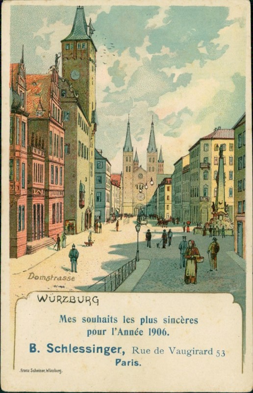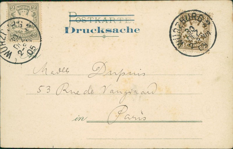 Alte Ansichtskarte aus Würzburg, gelaufen am 30.12.1905 von Würzburg nach Paris.