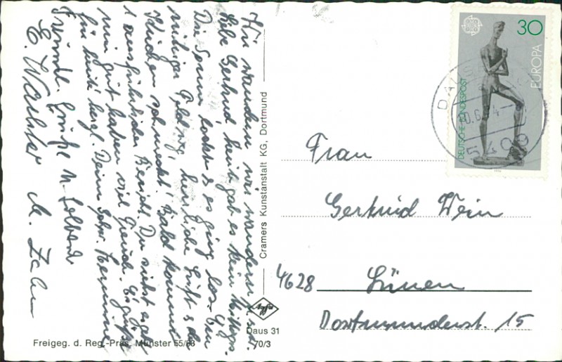 Alte Ansichtskarte aus Dausenau, gelaufen am 10.06.1974 von Dausenau nach Lünen.