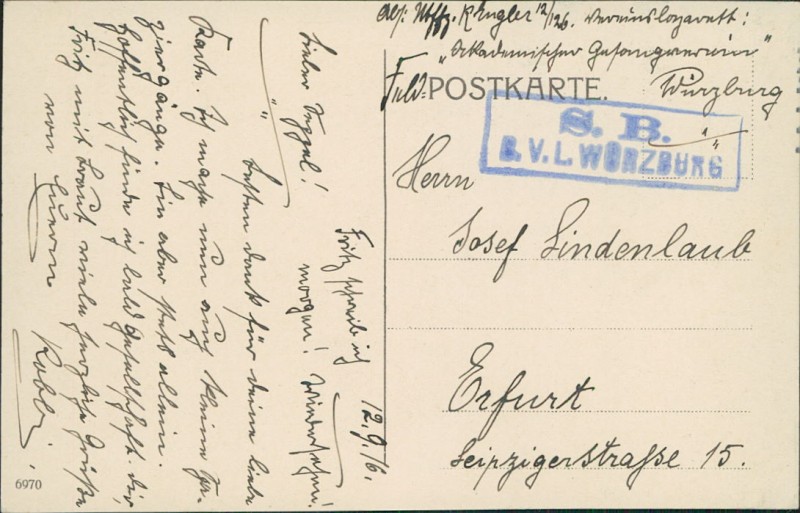 Alte Ansichtskarte aus Würzburg, gelaufen am 12.09.1916.