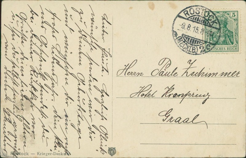 Alte Ansichtskarte aus Rostock, gelaufen am 09.08.1915 von Rostock (Mecklb.) nach Graal.