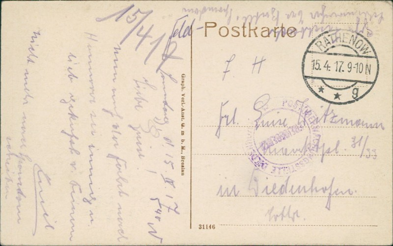 Alte Ansichtskarte aus Rathenow, gelaufen am 15.04.1917 von Rathenow nach Diedenhofen.