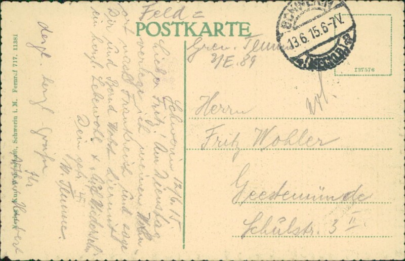 Alte Ansichtskarte aus Schwerin, gelaufen am 13.06.1915 von Schwerin nach Geestemünde.