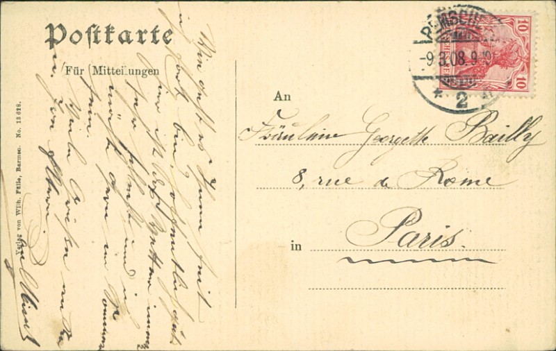 Alte Ansichtskarte aus Remscheid, gelaufen am 09.03.1908 von Remscheid nach Paris.