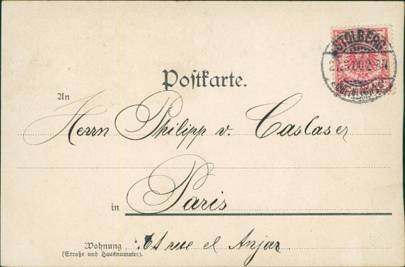 Alte Ansichtskarte aus Stolberg, gelaufen am 27.03.1900 von Stolberg nach Paris.