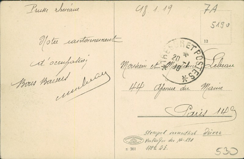 Alte Ansichtskarte aus Stolberg, gelaufen am 10.01.1919 von Trésor et Postes nach Paris.