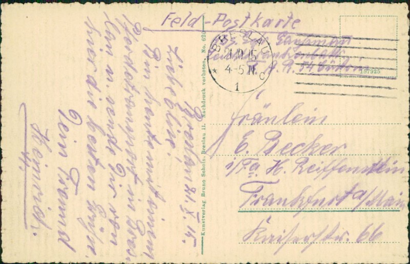 Alte Ansichtskarte aus Breslau / Wrocaw, gelaufen am 21.10.1915 von Breslau nach Frankfurt a/Main.
