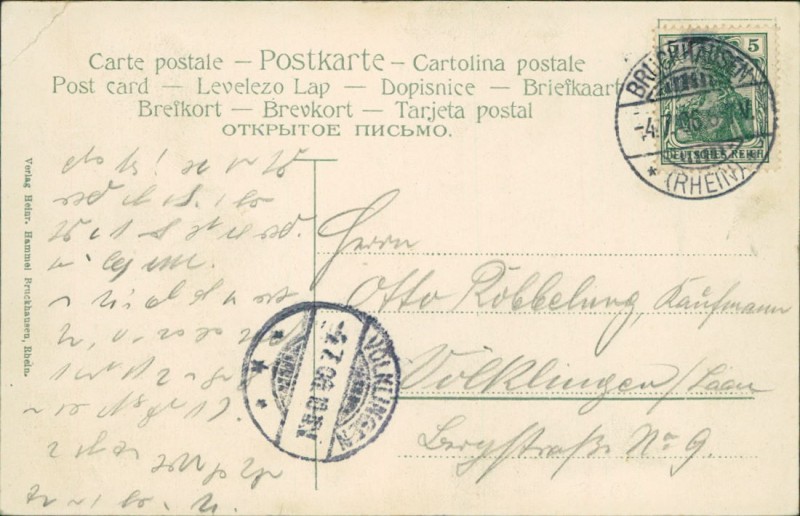 Alte Ansichtskarte aus Duisburg-Bruckhausen, gelaufen am 04.07.1906 von Bruckhausen (Rhein) nach Völklingen/Saar.