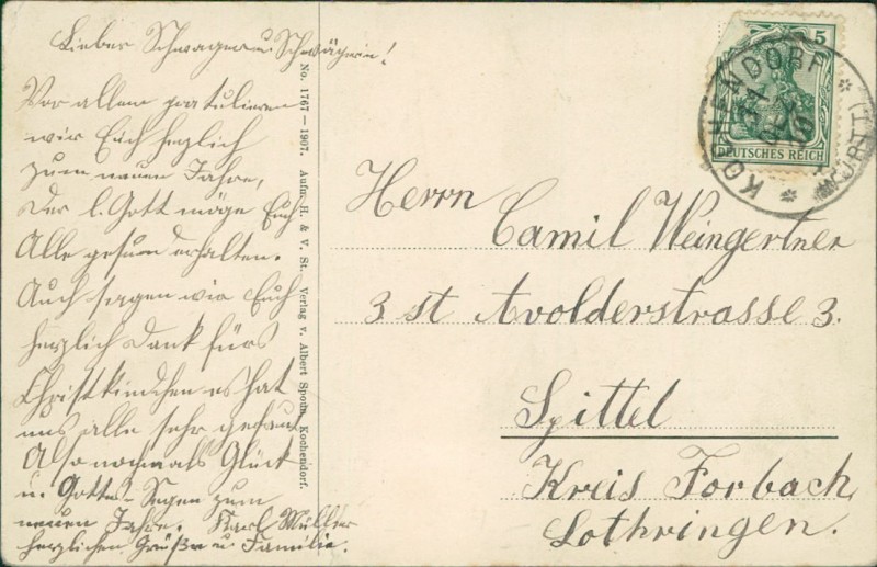 Alte Ansichtskarte aus Bad Friedrichshall-Kochendorf, gelaufen am 31.12.1910 von Kochendorf nach Spittel.
