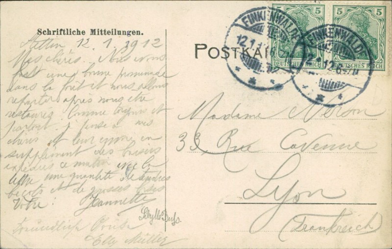 Alte Ansichtskarte aus Bukowe Gory / Buchheide, gelaufen am 12.01.1912 von Finkenwald nach Lyon.