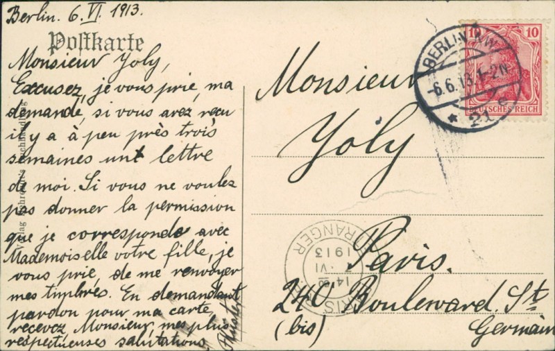 Alte Ansichtskarte aus Falkenberg-Höhe, gelaufen am 06.06.1913 von Berlin nach Paris.