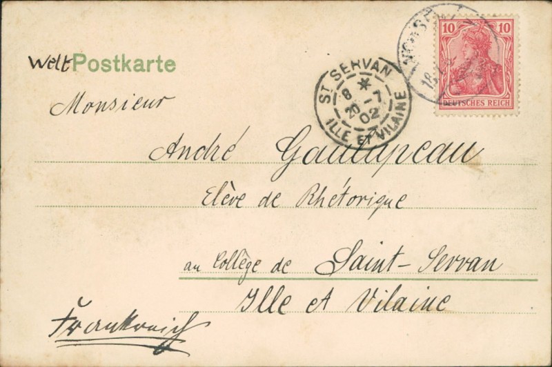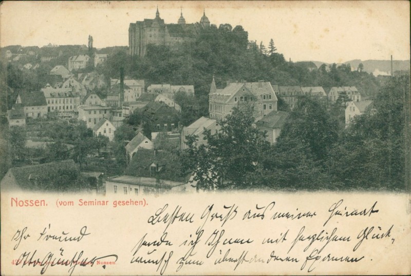 Alte Ansichtskarte aus Nossen, gelaufen am 18.07.1902 von Nossen nach St. Servan. Ankunft in St. Servan am 20.07.1902.