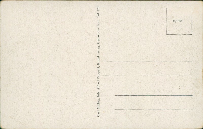 | Verlag | Carl Mittag, Inh. Alfred Pappert, Kunstverlag, Gernrode-Harz. Tel. 376 |