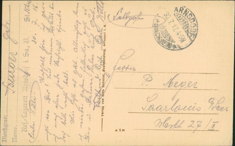 Alte Ansichtskarte aus Arnsdorf, gelaufen am 30.07.1917.