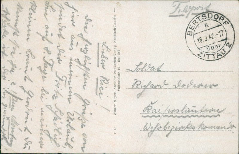Alte Ansichtskarte aus Bertsdorf-Hörnitz (Olbersdorf), gelaufen am 18.09.1942 von Bertsdorf nach Kaiserslautern.