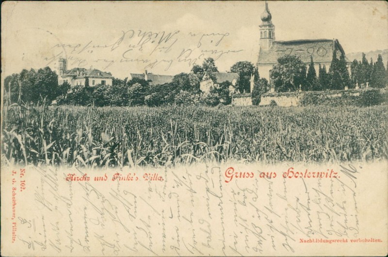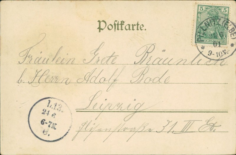 Alte Ansichtskarte aus Dresden-Hosterwitz, gelaufen am 24.06.1901 von Pillnitz (Elbe) nach Leipzig. Ankunft in Leipzig am 24.06.1901.