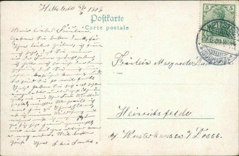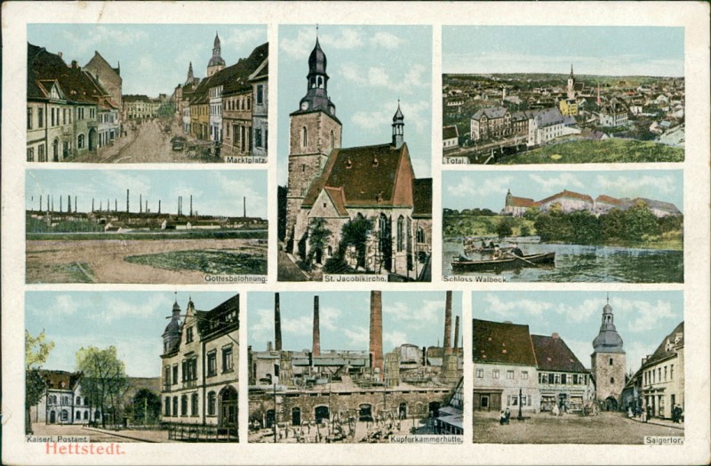 Alte Ansichtskarte aus Hettstedt, gelaufen am 29.06.1909 von Hettstedt (Südharz) nach Heinrichsfelde.
