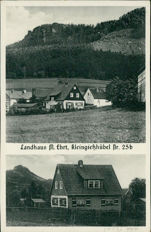 Alte Ansichtskarte aus Kleingießhübel (Reinhardtsdorf-Schöna), gelaufen am 10.08.1938 von Bad Schandau nach Berlin.