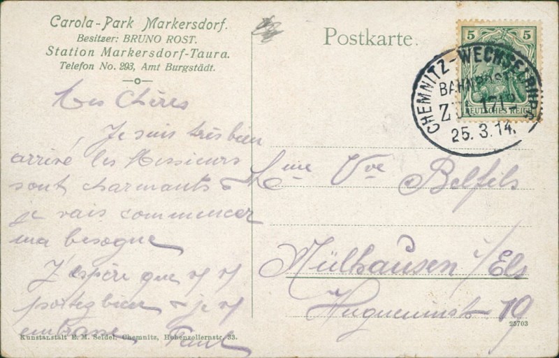 Alte Ansichtskarte aus Markersdorf, gelaufen am 25.03.1914 von Chemnitz-Wechselburg (Bahnpost) nach Mülhausen i/Els.