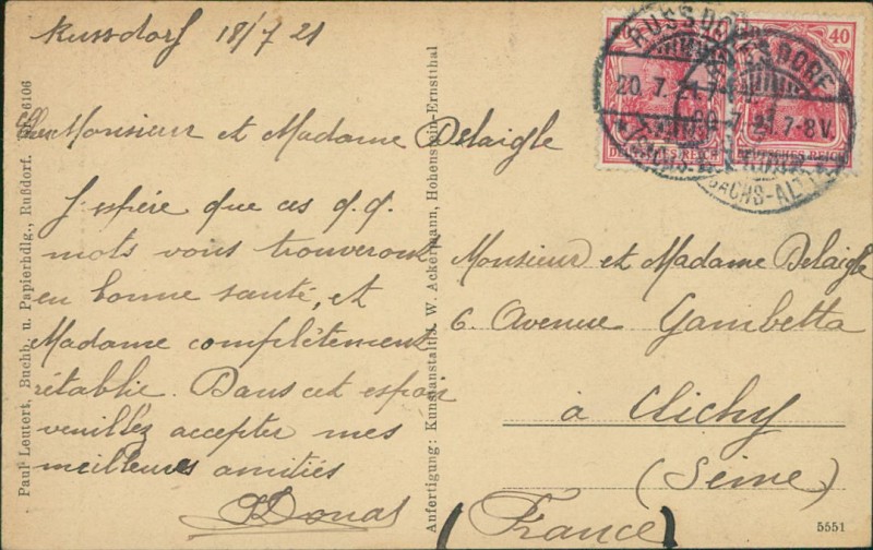 Alte Ansichtskarte aus Limbach-Oberfrohna-Rußdorf, gelaufen am 20.07.1921 von Russdorf nach Clichy.