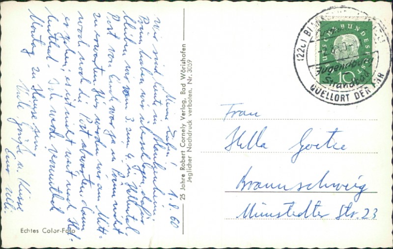 Alte Ansichtskarte aus Blankenheim, gelaufen am 02.08.1960 von Blankenheim (Ortswerbestempel) nach Braunschweig.