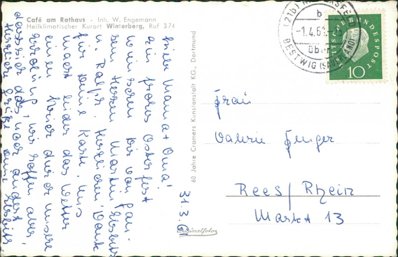 Alte Ansichtskarte aus Winterberg, gelaufen am 01.04.1961.