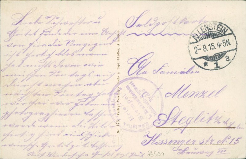 Alte Ansichtskarte aus Allenstein / Olsztyn, gelaufen am 02.08.1915 von Allenstein nach Steglitz.