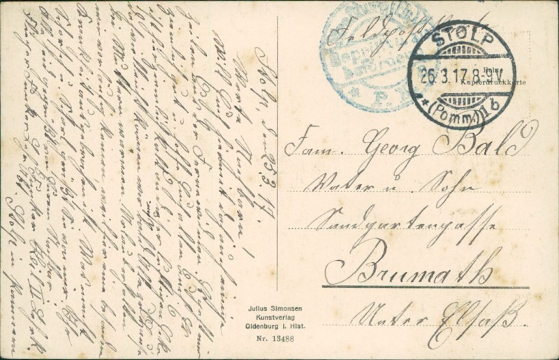 Alte Ansichtskarte aus Stolp / Supsk, gelaufen am 26.03.1917 von Stolp nach Brumath.